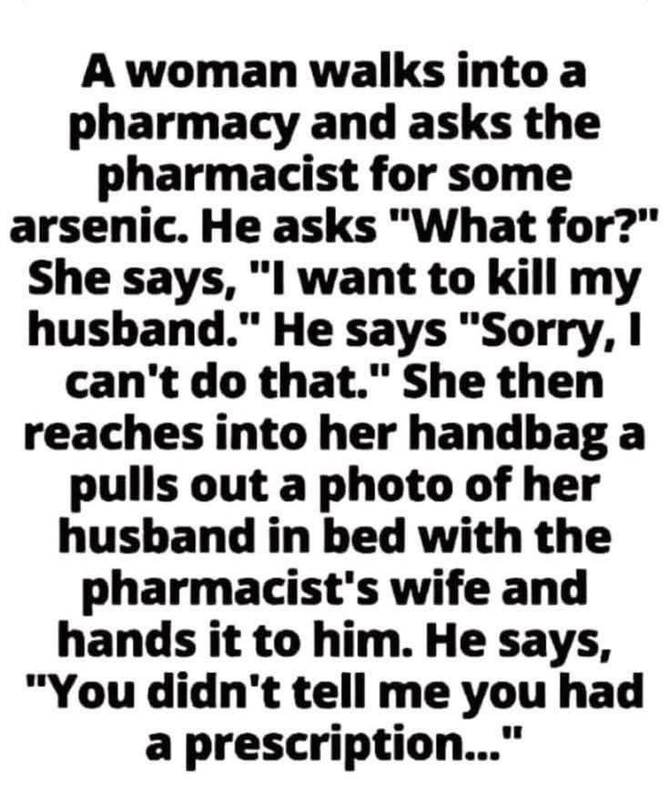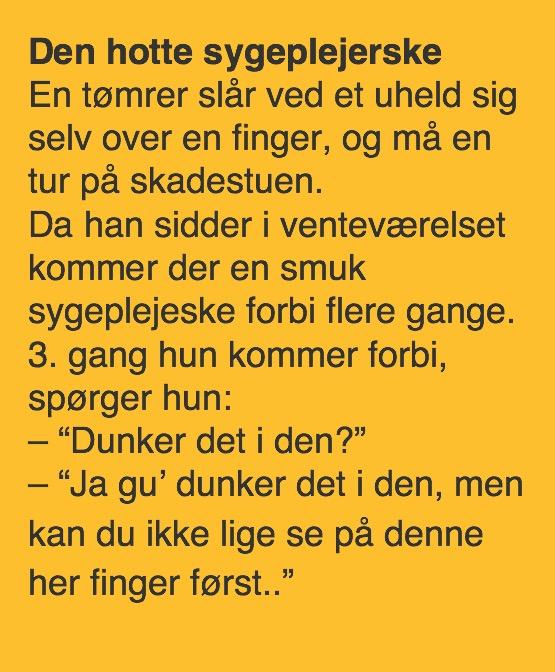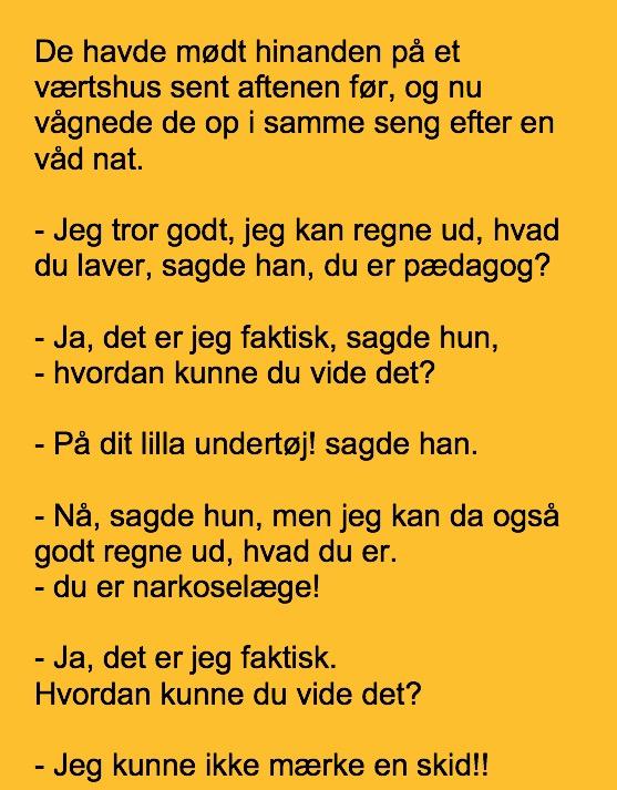Needy 2094 Skrevet 20. September En mand går ind på en kro og bestiller noget nudelsuppe. Da han får tallerkenen, kalder han på servitricen: "Hey, der ligger fandme et hår i suppen – den her betaler jeg ikke for!" Og så rejser han sig og skrider. Servitricen synes, det er lidt mystisk, så hun lister efter ham. Hun ser ham gå ind på et bordel, sniger sig ind og åbner døren – og dér sidder han med hele fjæset begravet mellem benene på en luder. Hun råber: "Hold nu kæft! Du brokker dig over ét lille hår i min nudelsuppe – og se dig så nu!" Manden kigger op og svarer: "Hør her, hvis jeg finder en nudel herinde, så betaler jeg sgu heller ikke for det!" 3 Citér indlæg Del dette indlæg Link til indlæg