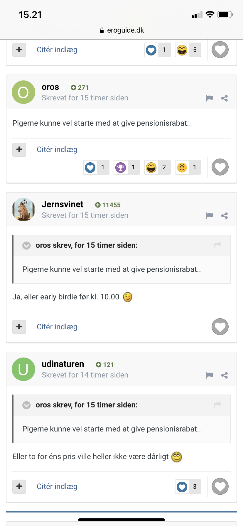 spaceman 103 Skrevet 4. August, 2021 SweetMilf6630 skrev, den 2.8.2021 at 11:39: Det er også helt fair i vælger ud fra hvad I har råd til. Men det er tit der herinde direkte eller indirekte hentydes til især de danske piger er for dyre. Og når det samtidig antydes at pris og kvalitet hænger sammen er der jo ingen der har lyst til sænke prisen. Jeg tilbyder selv usikker sex. Og hvis jeg skulle ændre det nu efter alle de år ville jeg miste hele den kundegruppe jeg har. Ville nok få en anden kunde gruppe, men om dem ville være større eller mindre vides ikke. Synes bare generelt man skal holde sig til at tale om piger man rent faktisk har mødt og ikke formode ting. Men findes ikke ret mange andre sociale medier hvor priser på ting diskuteres. Har man ikke råd til BMW køber man en anden bil. Mit oprindelige opslag var det heller ikke pris niveauet der var til debat udelukkende hvilken måde folk foretrak. Ser også nogen der kommenterer på mængden af piger (udvalget) er blevet mindre. Og det er da meget logisk når der er mange elementer der demotiverer til at have jobbet. Jeg kunne bare lade være med at læse herinde så var jeg lykkeligt uvidende. Men rart nok lige at følge lidt med. For mig er det nok prisen der trykker men også ydelserne, jeg er til blow uden kondom og der er forskellen hvorfor jeg tager til København og køber sex i stedet for en tur til CityGirls i Helsingør for med togbillet ender prisen nok på det samme. Du ligger absolut ikke i den dyre ende men som nævnt før bliver jeg helt forvirret, vi er mænd der er styret af det forkerte hoved når vi er liderlige, så det skal være så simpelt som muligt. Citér indlæg Del dette indlæg Link til indlæg