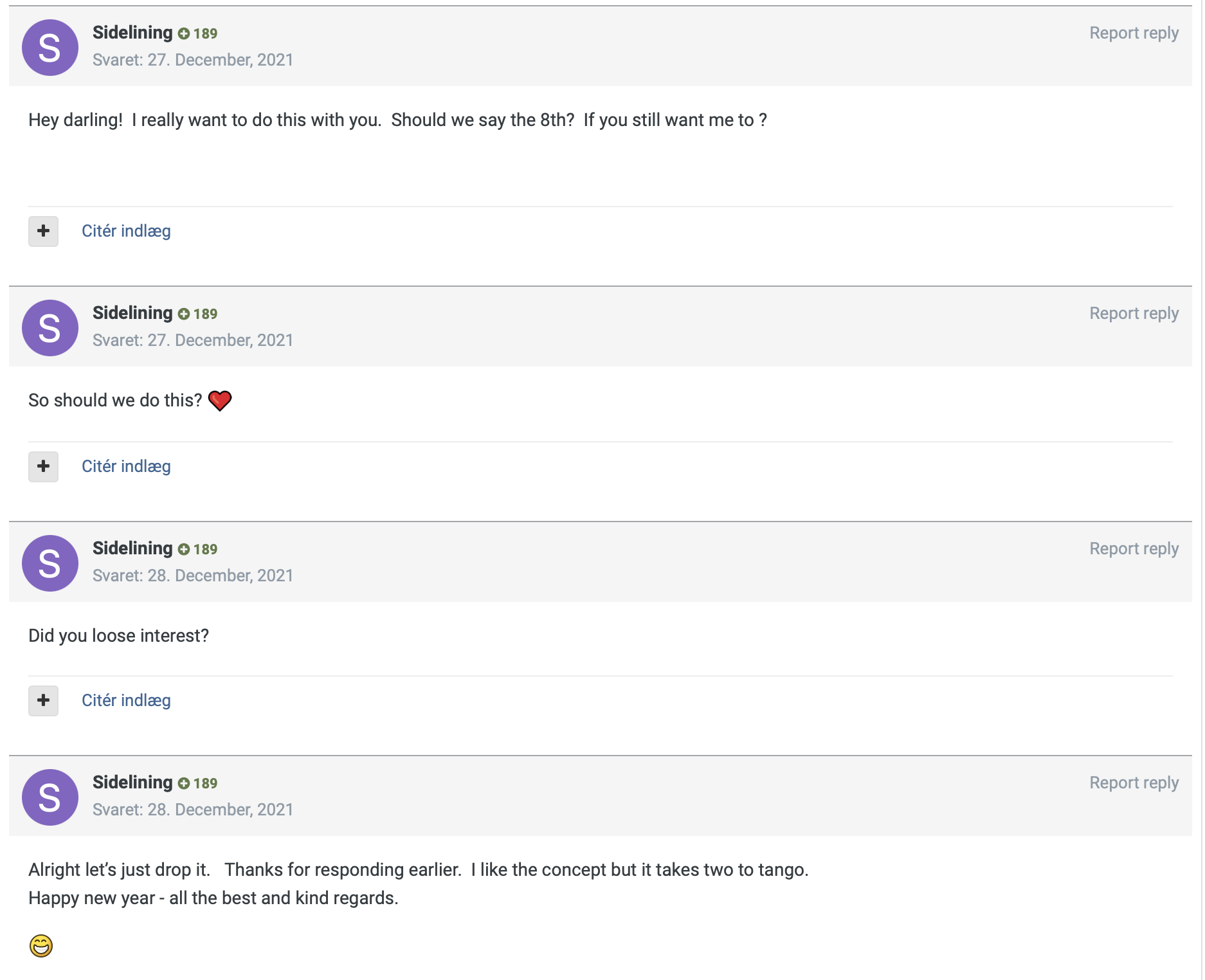 Men jeg kan jo se af indlæggene herinde, at det er dig, der til at begynde med fremstiller det som om I har har noget, der minder om en aftale, på trods af at I ikke har noget, der minder om en aftale. Derved sætter du hende i et meget dårligt lys, og antyder at man spilder sin tid, for hun bliver pludselig tavs selvom man nærmest har en aftale. Det er ret uhæderligt af dig.