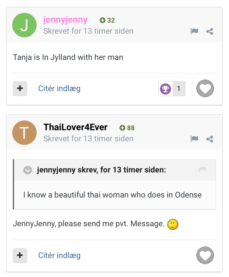 Stapler 2595 Skrevet 22. Maj, 2024 ThaiLover4Ever skrev, den 20.5.2024 at 20:50: JennyJenny, please send me pvt. Message. @ThaiLover4Ever , @sportydick @Langkilde og @natdyr Lad være med at skrive i en offentlig tråd at i ønsker PM. Skriv en PM til personen istedet for at bumpe tråden med noget, der er irrelevant for andre end dem i ønsker en PM med. 2 Citér indlæg Del dette indlæg Link til indlæg