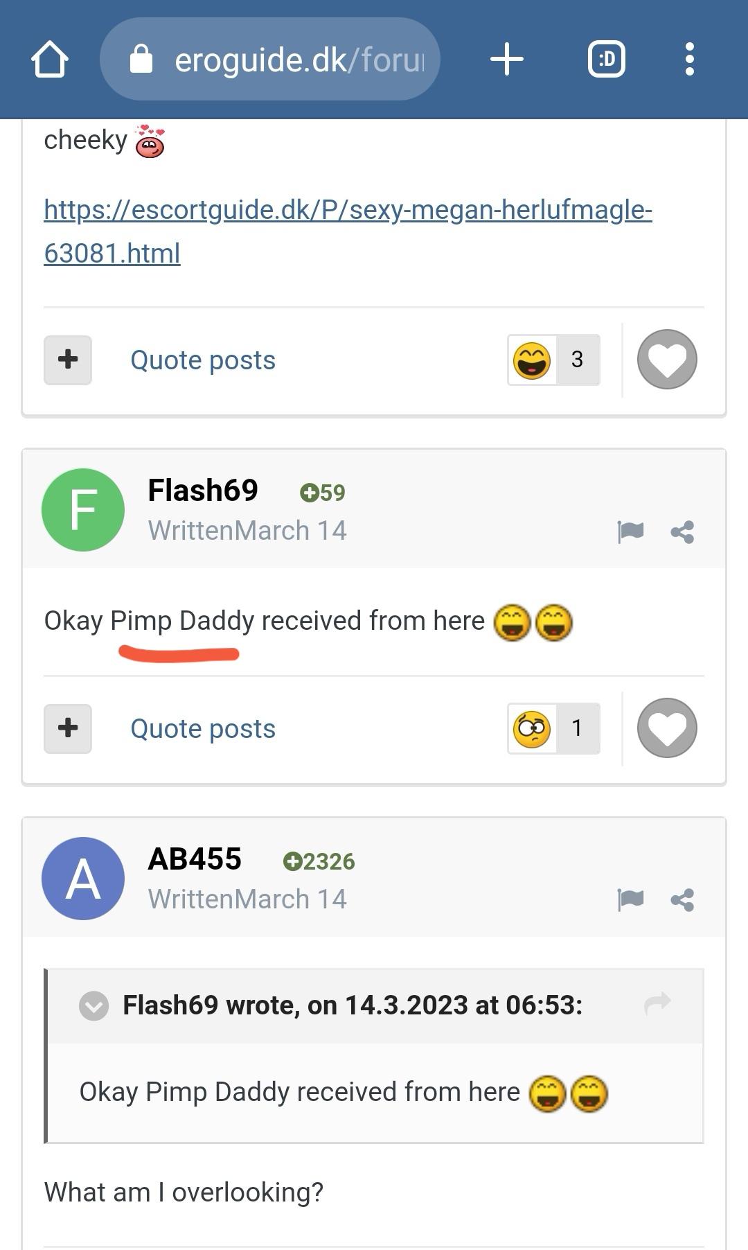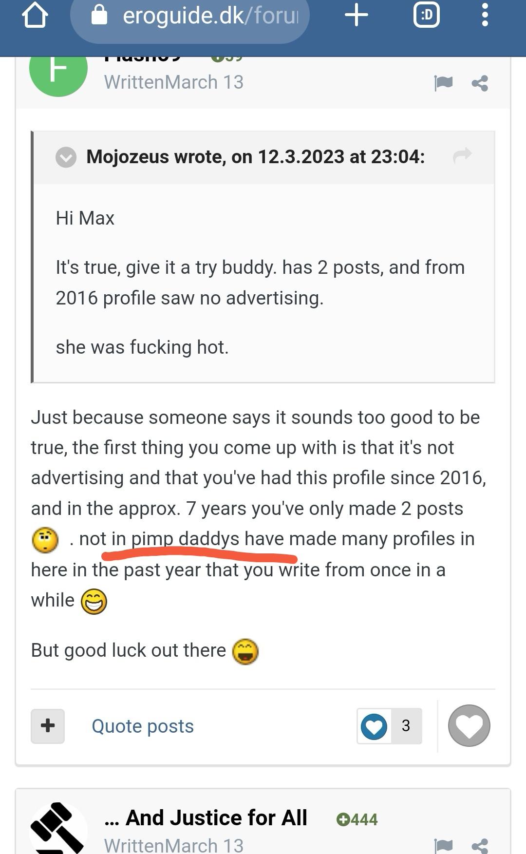 Summer young 80 Skrevet 20. Marts, 2023 BiggusD skrev, for 2 minutter siden: Dear @Summer young @DanTheMan69 is a virgin-fresh user, created more or less at the same time as the positive review. That in itself may raise doubt on value of the report. Could be true - could be yourself or a "pimp" as @Flash69 argue. So the alert he raises is ok, although a little harsh IMO. @reknas complains that all your positive reviews are immediately posted on your add, but it seems that you are following EG intensely, and reacting promply. I think it is quite common with the younger women that they are paying a lot of attention. Of course you shall link to the positive feedbacks, and it is nice that you engage in the discussions in here. So that I would not consider a problem. I dont think the comments that you do not like should be removed, and I recommend that if you want to counter them simply refer to number of happy guest that you have. I dont think you talk shit back, despite your frustration. If somebody writes a negative review in here, you also have to option to ask in PM why he had this experience, and perhaps learn from it if it makes sense. If it does not, then just leave it behind. Other users will go to your add and search for themselves in EG to find recommendations. There will always be some people who are unfair for one reason or the other, but don't let that go to your head, and trust that most users are able to judge for themselves. Personally, I lean towards that the good reviews you get are legitimate, you look attractive and your many photos are clearly real, so based on that I would be happy to visit you. Unfortunately, my hood is not Kolding... So cheer up, and carry on. Have faith in yourself, and dont let a few bad words ruin your day. He made the appointment last evening when he said he visited me!!! You don't really belive that it was me and my pimp in this conversation?? Yes the comments should be deleted becouse they are fake and will completly bad intent!!!! 1 Citér indlæg Del dette indlæg Link til indlæg