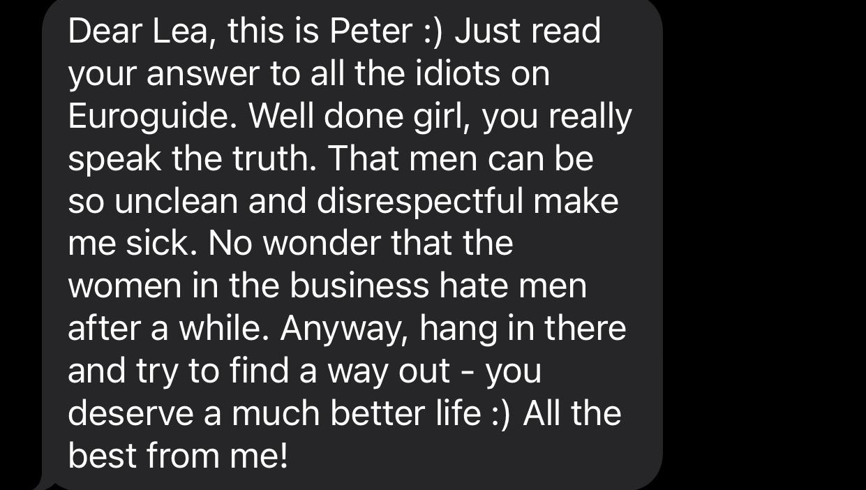 Guest tvr Skrevet 15. September, 2023 Jeg har ikke besøgt Lea endnu. Men I er godt nok hårde ved hende her. Spørgsmålet er efterhånden om falske anmeldelser eller uhæmmet kritik er det værste her...... Jeg er helt forelsket i hendes øjne, de er godt nok smukke. Og læberne, hvis hun kysser. Gør hun det? Citér indlæg Del dette indlæg Link til indlæg