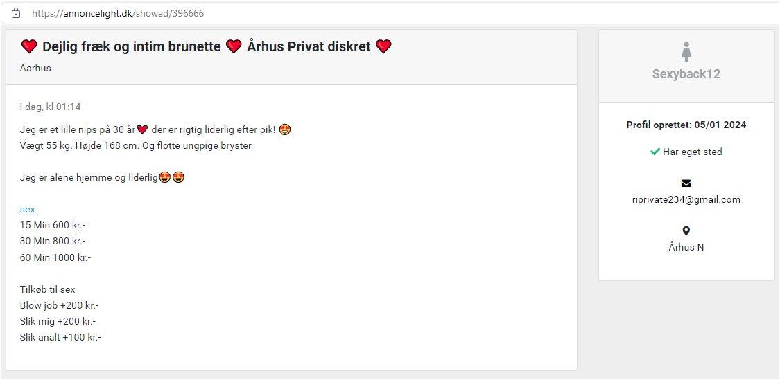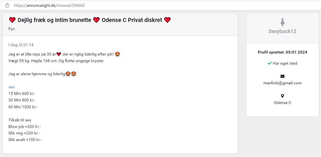 Julius 1411 Skrevet 24. Februar, 2024 Her er vist en, hvor man lige skal passe lidt på. https://annoncelight.dk/showad/396666 I morges var "hun" i Århus N, nu i Odense. Samme annoncenr., samme tekst, men forskellige mailadresser. Citér indlæg Del dette indlæg Link til indlæg