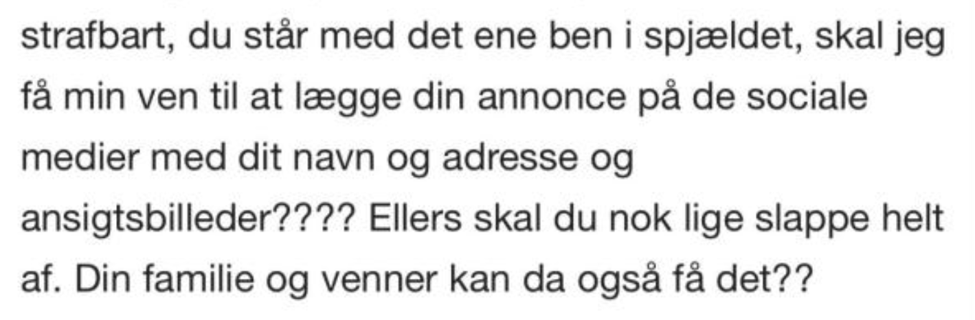 [email protected] 24 Skrevet 13. Juli, 2024 Det handler ikke kun om en spammail.. Personen opretter mange mails og laver fake aftaler og “sladrer” rent faktisk også. F.eks har han en, der hedder noget med “Hansen”. Så, det er ren chikane. Og det går udover dit og mit privatliv. Somsagt tror han at rufferiloven er til for ham, så han kan true med “fængsel” osv. Men rufferi loven er til for at beskytte prostituerede mod at andre må tjene penge på dem. Han har misforstået hensigten lidt. 3 Citér indlæg Del dette indlæg Link til indlæg