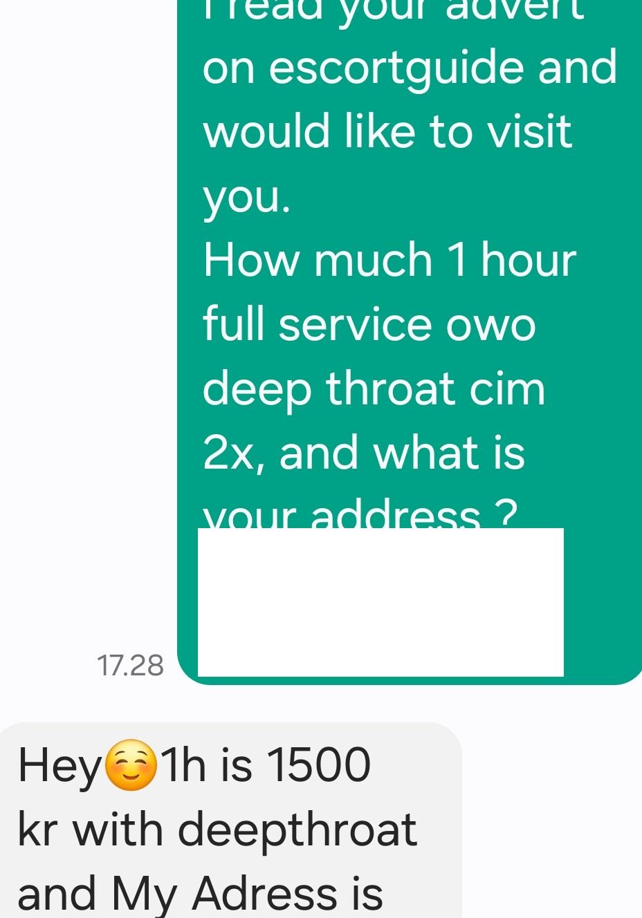 Jeg kan se fra din billede af din besked med hende, at hun svarer at 1 time med deep throat er 1500kr. I at hun er ny, ved pigen sikkert ikke hvad alle ydelser og ting er her i dk. Når jeg læser hendes svar kan jeg se at hun ikke ved hvad owo, cim er og hvad fuld service indebærer. For mig fuld service kan også være sex uden condom. Jeg tror du mener GFE, ikke?