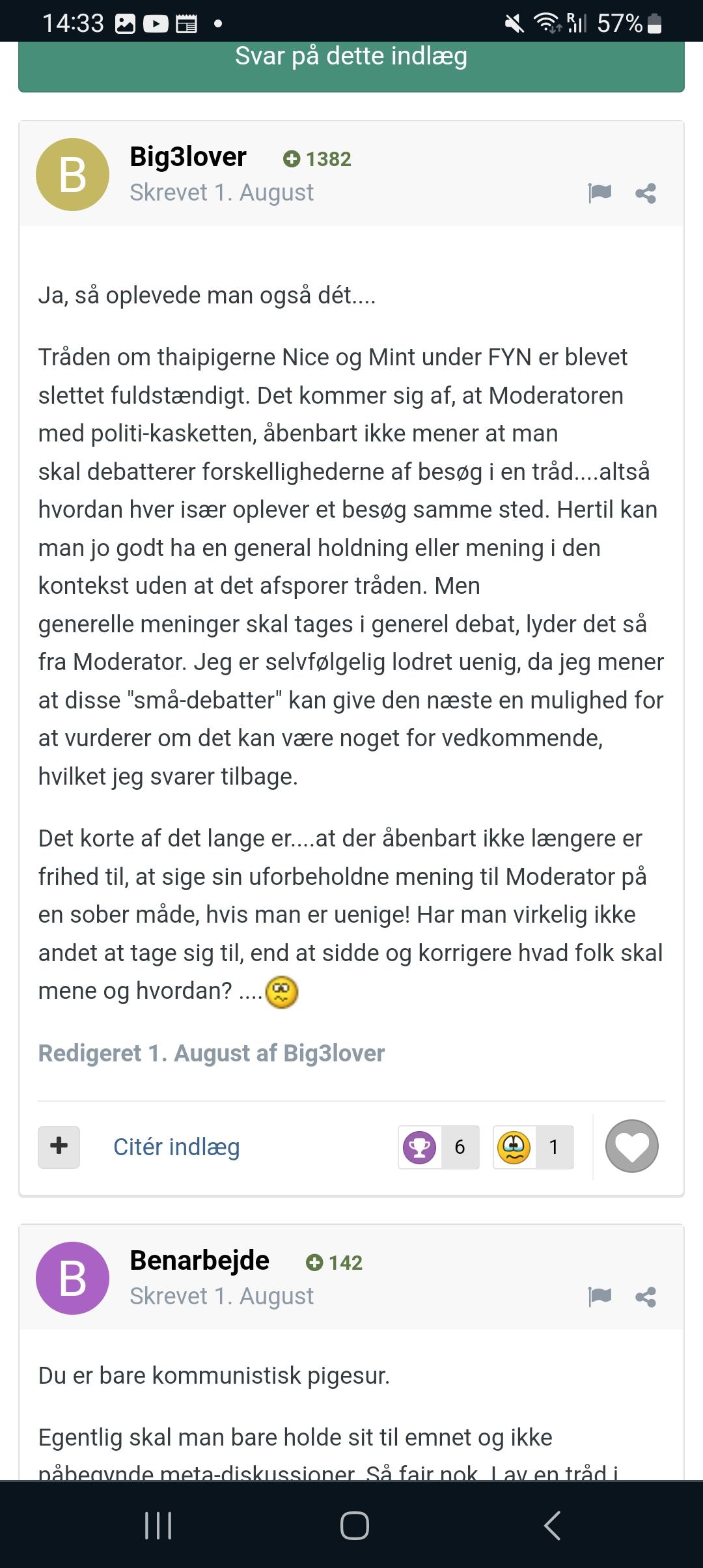 Big3lover 1480 Skrevet 25. Oktober, 2024 nillerniller skrev, for 36 minutter siden: Endnu en bruger, der hyler løs uden at fortælle, hvad han evt kunne have afsporet med. Flere gange. Skal vi checke? I øvrigt er dine afsporinger blevet anmeldt. Mod sidder ikke selv og leder. Åbenlyst. Hvis du ønsker svar, kan du evt udskifte en lang serenade om uretfærdighed med at 'kalde på' en af dem via @ Mit indtryk er at især Stapler er fin til at forklare og endda udrede, undskylde og fjerne ban, hvis han skulle have lavet en fejl. Gjorde han bla overfor dig. Flot. Fedt. Men en del brugere med ban ter sig lidt som små børn pga karantæne til en privatejet forum med klare regler og kun 2 moderatorer. Måake kunne man bakke lidt mere op om dem og reglerne? Også selv om der sker fejl. Mon de mange hylere i Feedback forum har overvejet, at måske de fleste andre brugere kan værr enormt trætte af afsporing, internt fnidder og takke korrespondencer og 'humor'. Er det 3 brokke tråde du har lavet siden august efter advarsler og ban til dig selv? Hvis ja, kunne det ligne et mønster, du trods advarsler ikke vil eller kan acceptere. Får man ban ved førstegangsafsporing? Eller er du helt ærlig? HAR du afsporet flere gange og måske kort tid efter hinanden? Efter reglerne. Lad være at gemme dig/Jer/os bag infantile udbrud uden hold i virkeligheden som 'moderatorerne er magtsyge' og 'de har ingen humor/der er ikke plads til humor'. Der er regler, man kan være uenige i. Men de skal stadig bare overholdes og er ret enkle også for vi andre, der selvforskyldt er banned for at overtræde dem. Noget langt de fleste af os vist godt kan se bagefter. Nogle gange ved at læse reglerne igen. Hvis mod da ikke skrev det i advarslen/bannet. Hvilket han jo gjorde også til dig. AFSPORING. Jeg tænker det er en afsporing, du har lavet, mellem ban start og ca max 2 uger tilbage. Det har mod forklaret tidligere. De går ikke alen langt bagud, trods anmeldelser (fair). Vi kan kalde det et VAR system, hvor brugere gør VAR opmærksom på lige at kigge indlæg igennem for fx personangreb, offentliggørelse af adresse, afsporing. Er det virkelig så svært at forstå. Hvis du er uenig, henvend dig til mod og bed om en forklaring (husk de ikke er her 24/7). Er du mopset, så er det andre brugere, der har syntes, du har afsporet en tråd. Flere gange åbenbart. Prøv evt selv at kigge dine 20-30 indlæg igennem fra den 2-3 ugers periode og se, om du ikke godt kan regne ud, ud fra REGELSÆTTET, hvad det er for en kommentar, du har afsporet en tråd med. Og er de blevet slettet, må du jo lave en @ og høre, hvad din afsporing var SPECIFIKT. Der er vel kun 2 muligheder: enten er der sket en fejl og du har aldrig afsporet før (kig dine advarsler) eller du HAR afsporet (måske uden at få skåret ud i pap ift HVAD i HVILKEN tråd) og får måske en ban/ekstra pga tidligere advarsler/ban (sidste var en adresse, der dog var en fejl iflg Stapler). Men hvorfor hyle op om det? Konstruktivt? @ søg da en forklaring, hvis du er reelt nysgerrig og gerne vil lære ikke at gøre det igen. Hvis du blot er anarkistisk og piber som en håndfuld eller to andre netop returneret efter ban, så er det...bare piberi. Og denne tråd med likes og svar viser vel fint, hvem der er anarkistiske og hvem, der rent faktisk er glade for regler og moderatorernes arbejde SELV når det går (selvforskyldt) ud over en selv. Og flere af dine likes er fra 'nye profiler' med mere piberi, grimt sprog, der kunne tyde på det er gamle profiler med permanent ban. Hvilket jo undrer lidt; hvorfor komme retur til en side med regler, man hverken er enig i eller vil overholde.... HVAD STÅR DER PÅ DIN PROFIL VED ADVARSLER? Du kunne evt melde dig som moderator..... Ja moderator kunne åbenbart ikke fortælle hvad det ban gik ud på....men måske du kan, nu du er igang med at tjekke? Det er fuldstændigt ligegyldigt hvor mange afsporinger jeg har fået. Bliver man bannet er det mindste sgu da at fortælle hvorfor. Tænker heller ikke du kan nævne én herinde som IKKE har lavet en afsporing i en eller anden form på ét eller andet tidspunkt. Men måske det bare ikke er blevet anmeldt Del dette indlæg Link til indlæg