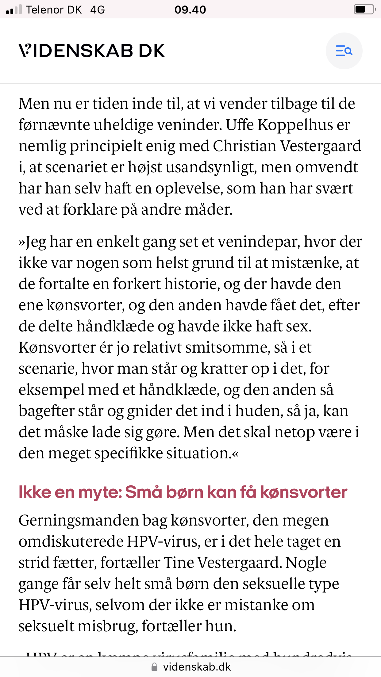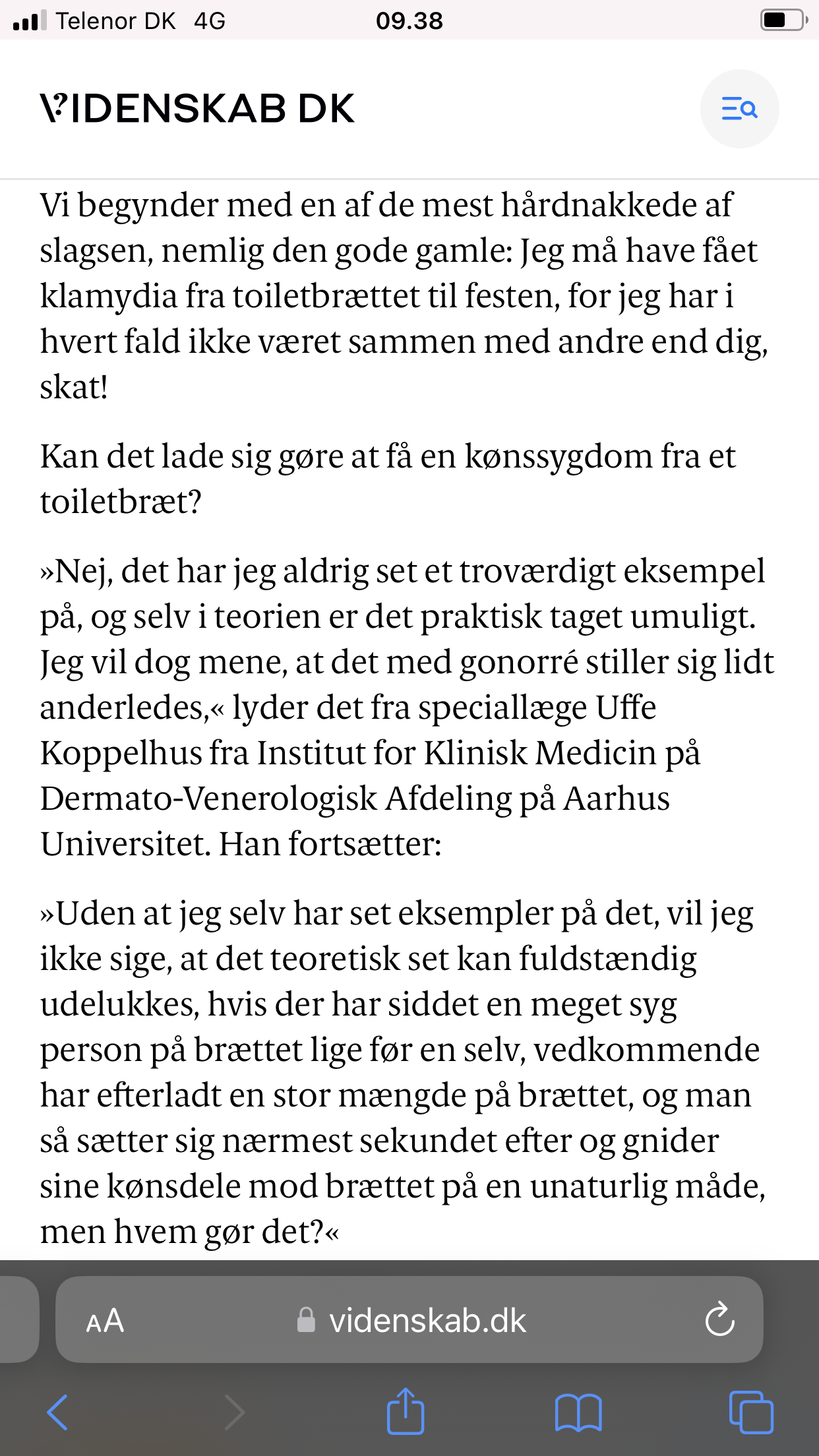 ErnstOle 695 Skrevet 11. December, 2024 JenniferRomantica skrev, for 23 minutter siden: Så når en tissemand er inde i en tissekone så rør urinrøret ved kvindens skede eller hvad fabler du om.? Eller penetrere skeden urinrøret eller.? Du godt klar over at slimhinderne sidder også heeelt ude i enden af urinrøret ikke.? Altså udgangen der ved mænd er direkte synlig.. Du fik med at jeg skrev at hun skulle have rørt sig selv umiddelbart før handjobbet ikke.? For hvis ikke du lige havde fået det med så forstår jeg godt din påståelighed.. Når der er penetration rører slimhinderne hinanden og smitten kan ske derfra. En mand bliver ikke smittet ved et handjob ,selv om en smittet kvinde har rørt sig selv forinden hun giver. Ligesom man fx heller ikke bliver smittet ved at dele et håndklæde eller toilet med en smittet person. Du må gerne henvise til en troværdig artikel eller lignende, hvor det står helt konkret. Som jeg nævnte tidligere, så bør man kende lidt til bakteriernes formering og patogene egenskaber, hvis man vil forstå det. Citér indlæg Del dette indlæg Link til indlæg