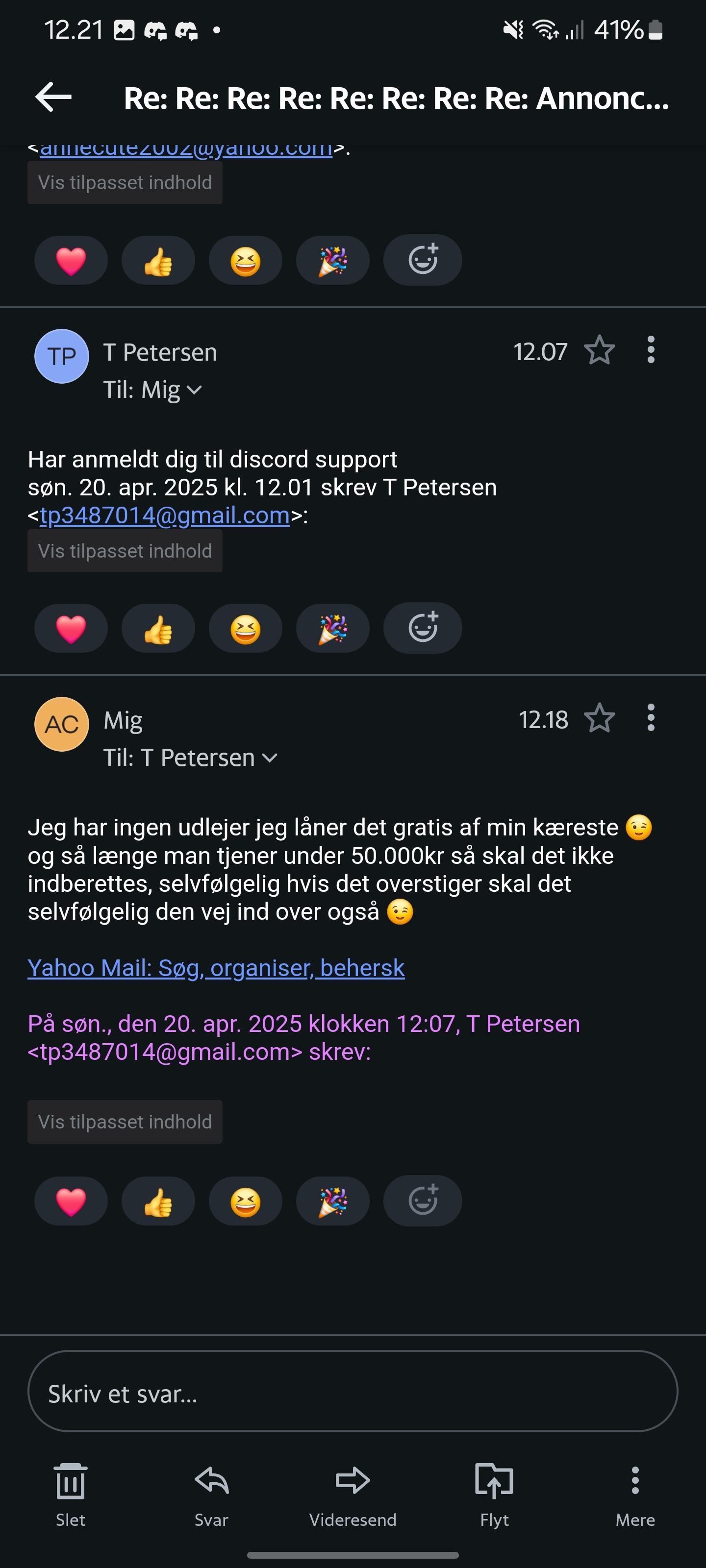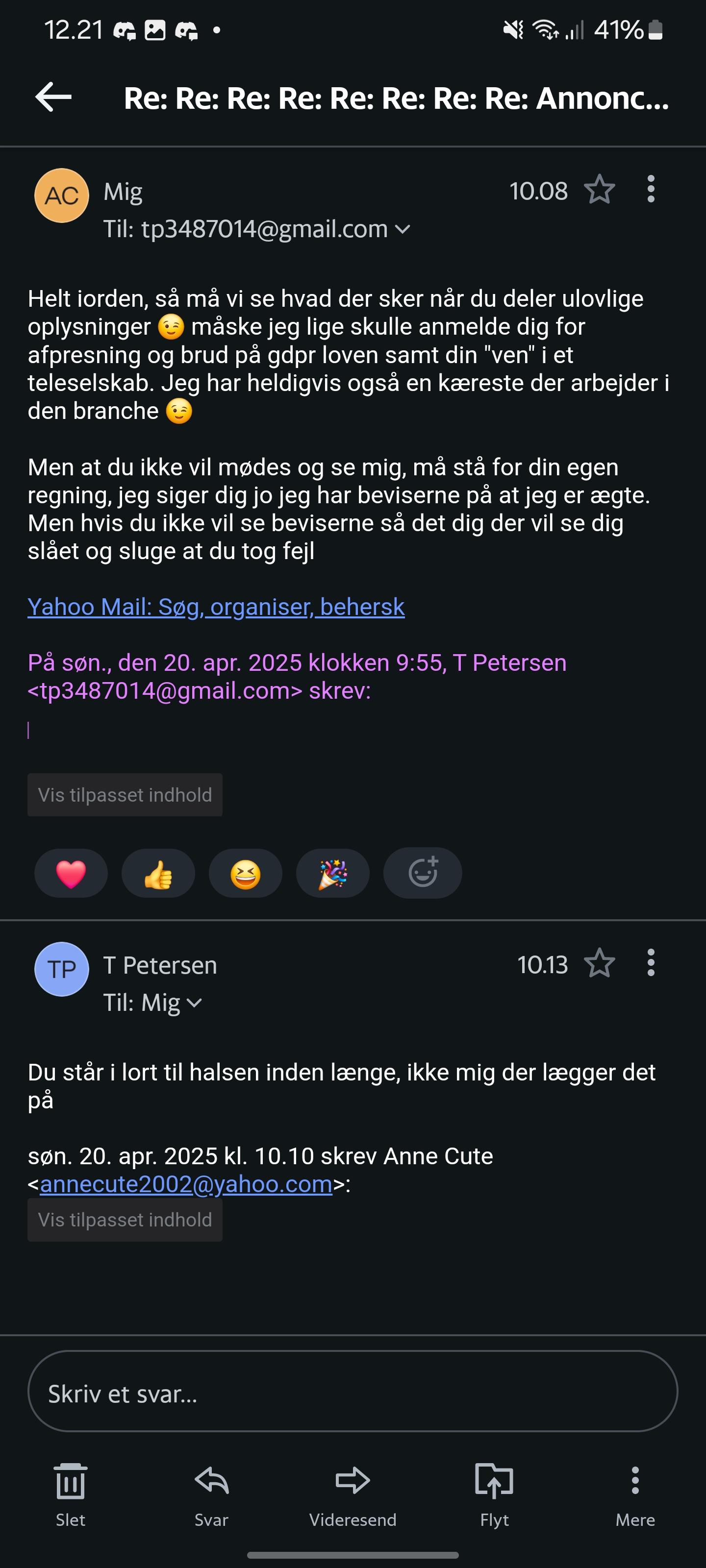 Den Anonyme 1063 Skrevet 21. April (edited) At indgå i en dialog med ham, er dumt. Bloker ham. Men at du giver ham så meget info om dig selv, giver absolut ingen mening. Det er kun ammunition til ham. Redigeret 21. April af Den Anonyme 1 Citér indlæg Del dette indlæg Link til indlæg