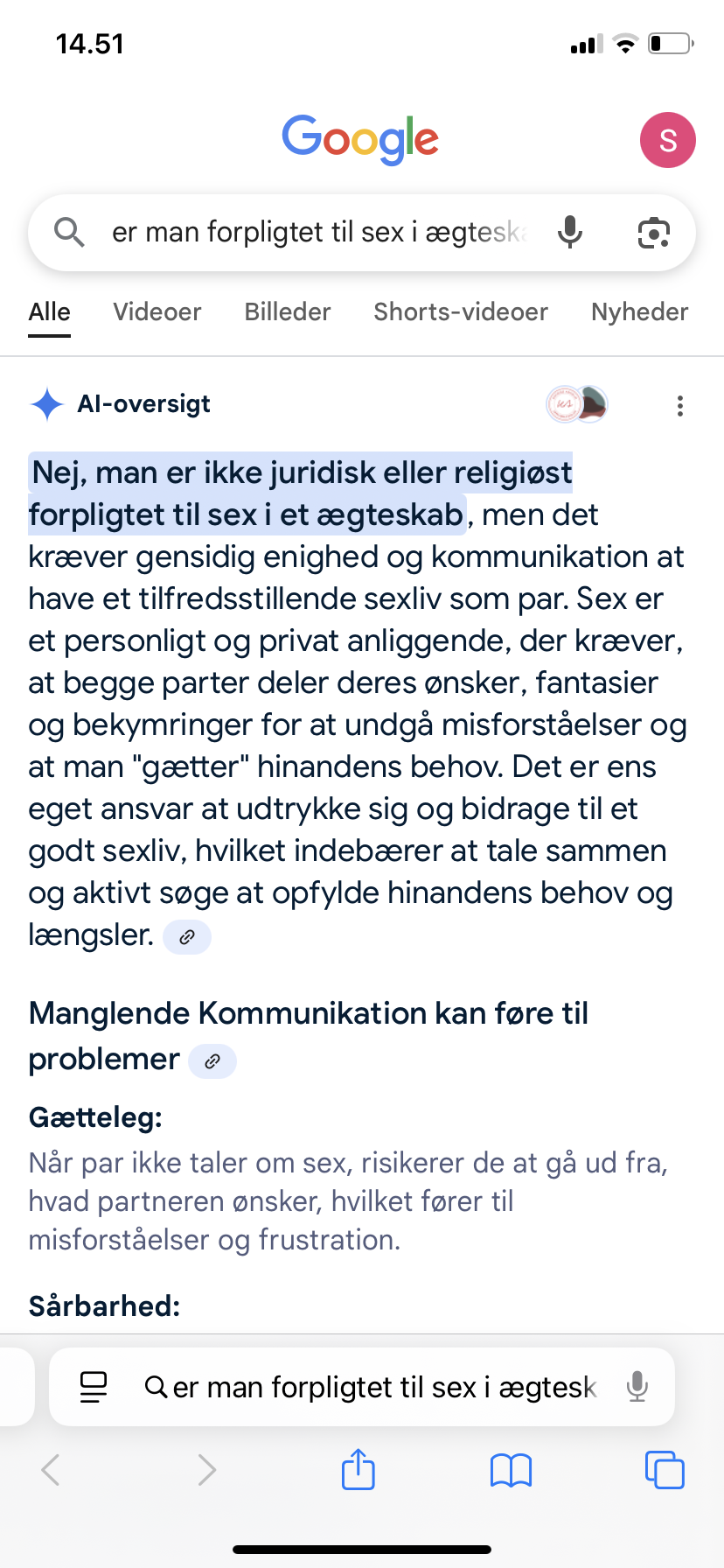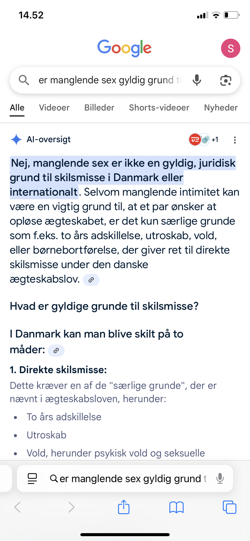 SweettieDK 1879 Skrevet 15. September Probator skrev, for 3 timer siden: Enig. Det staves forskelligt. Men juridisk set betyder det helt det samme. Og manglende samliv (sex) er gyldig grund til at få tildelt skilsmisse. Det må du gerne lige fremvise beviser for. Jeg har googlet og finder kunder modsatte. Jeg tror I mænd i Jeres frustration går og laver lidt jeres eget regelsæt. Og ja de viste er AI svar men har også bladrer gennem de andre svar muligheder. Og finder intet der beviser din påstand. 1 Citér indlæg Del dette indlæg Link til indlæg