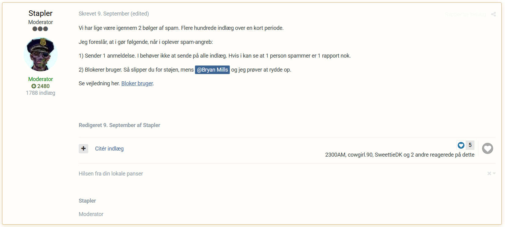 Den erfarne 361 Skrevet 24. November, 2025 Faldt i en anden tråd over dette indlæg fra mod-teamet som jeg synes er vigtigt at kende til. Jeg har selv flere gange været voldsomt irriteret over de spammere, og har et par gange siddet og anmeldt mange spam indlæg fra samme bruger. I går prøvede jeg at holde trit med en superspammer, han nåede at lave over 100 indlæg på et par timer og jeg sad og rapporterede løs. Dette for at hjælpe med at holde vores fælles forum frit for disse tosser så det ikke ender som den norske side.. Nu ser jeg så at det kun er nødvendigt at rapportere en bruger (spammer) en gang. Jeg havde endda tidligere givet et like til et andet indlæg i samme tråd, men beskeden var åbenbart ikke sivet ind For en god ordens skyld er her link til ovenstående indlæg: https://www.eroguide.dk/forum/topic/203598-“spam”-på-eg-nogle-ødelægger-eg/?do=findComment&comment=1717710 Tak til Stapler og Bryan Mills for jeres indsats. I hører meget brok for tiden, så lidt ros er på sin plads 1 2 Citér indlæg Del dette indlæg Link til indlæg
